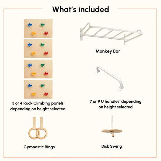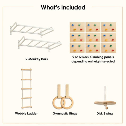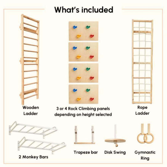 - This system allows you to customize the configuration, you can add or remove attachments (like the rock climbing wall, rope ladder, or swings) and adjust the height of the monkey bars as your child gets taller.
