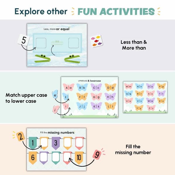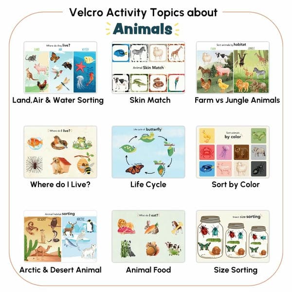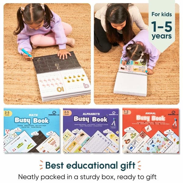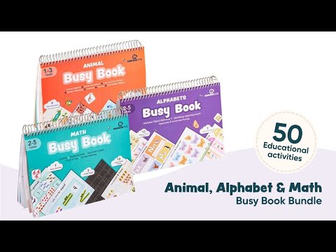 - 3 busy books that cover: Phonics, Counting, Sorting, Matching, Concepts like less or more, Sequencing, introduces wild, farm, aquatic, and jungle animals with matching, sorting, and fun interaction-based activities.