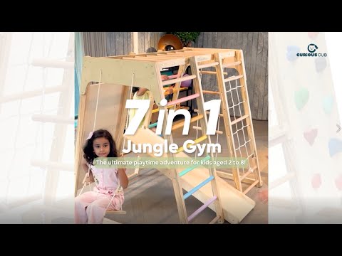 - 7-in-1 Jungle Gym ( slide, swing, monkey bar, rope climbing, rock climbing and wooden ladder)