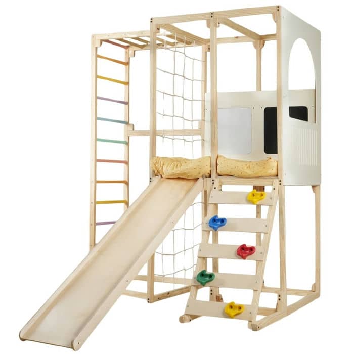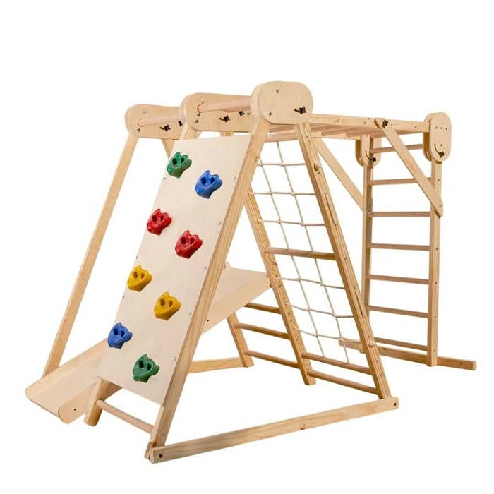 - Montessori-style jungle gym builds upper body strength (monkey bars, rock climbing) and gross motor skills ( rope and rod climbing, ladder).